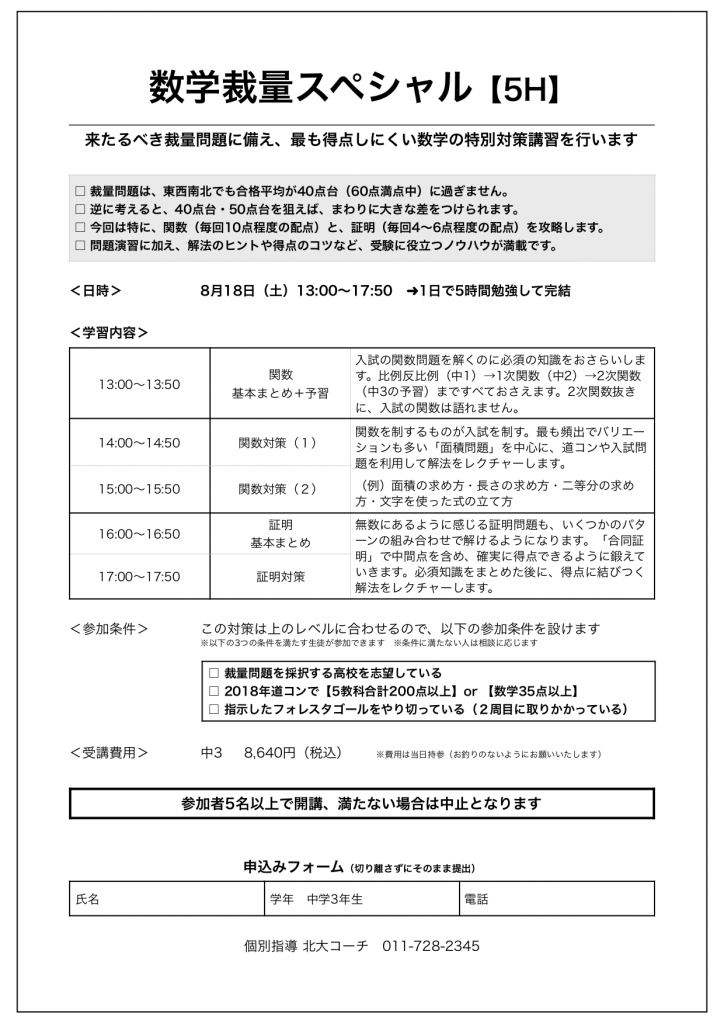 入試で最も得点が取りにくい、数学に特化した対策を行います。