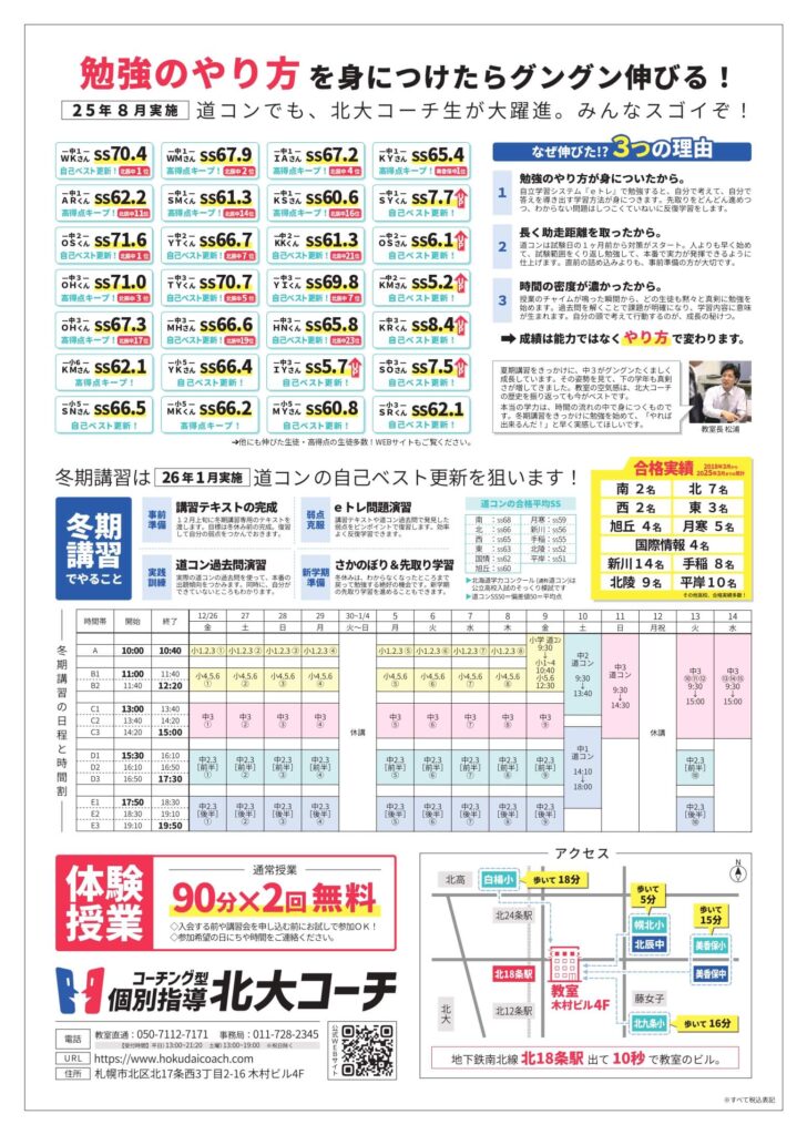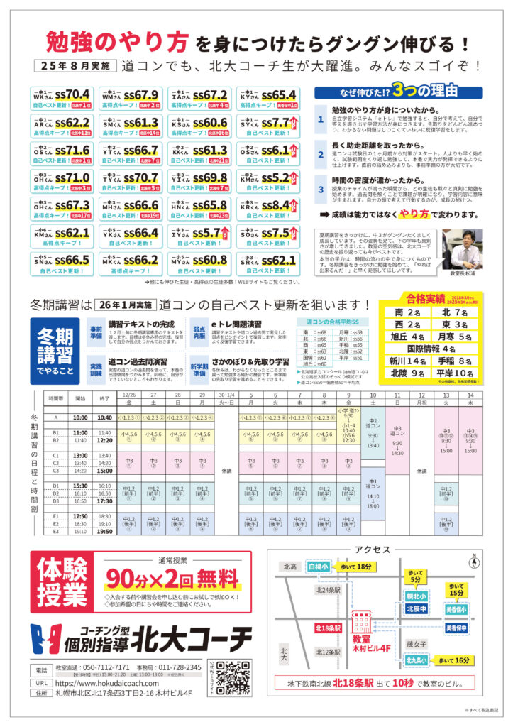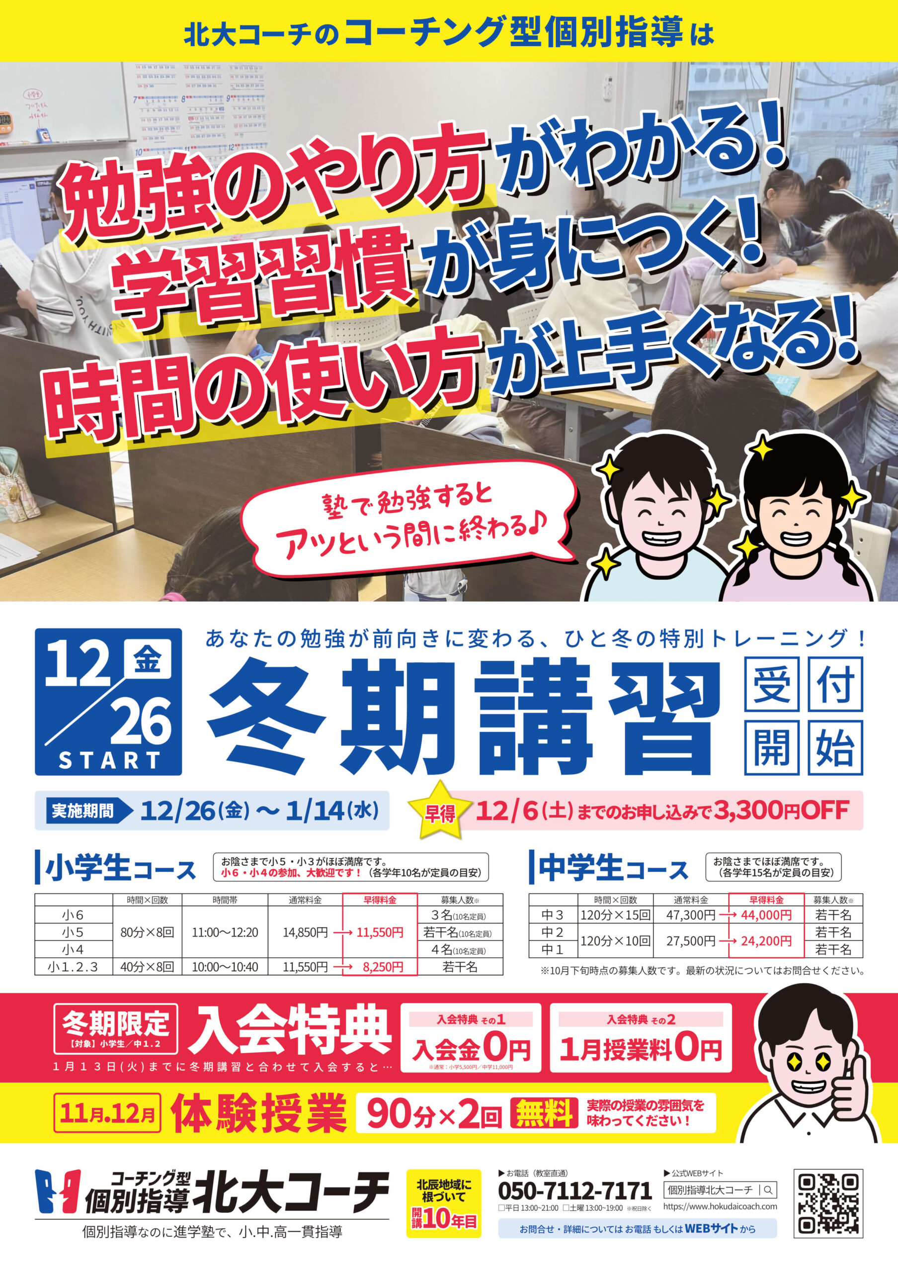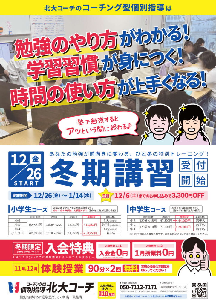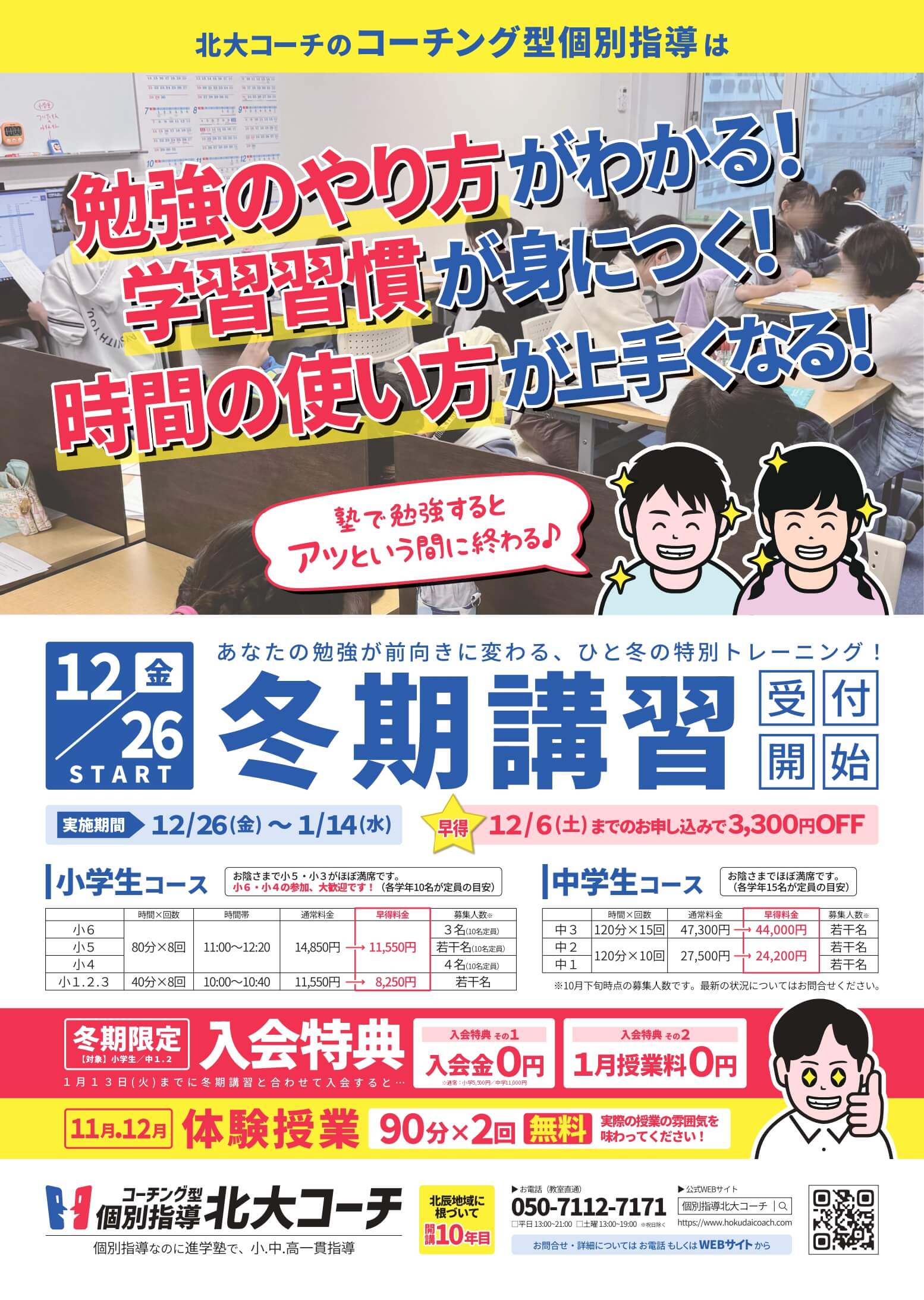 【全学年】25年12月冬期講習 2025.11.19 202512月26日(金)から始まる冬期講習のご案内です。 チラシ お申込みはコチラ 外部生の方で参加ご希望の方は、お問合せフォームからご連絡ください。 16:00以降は授業が始まるので、LINEやメールフォームからのお問合せが確実です。 ※会員の方は自動でお申込みとなるので、別途お申込みはご不要です。 お問合せお問い合わせ お電話 LINE メールフォーム お電話 教室直通:050-7112-7171事務局: 011-728-2345事務局は13:00〜19:00までの受付となります。お電話がつながりやすいのも、この時間帯となります。16:00か...