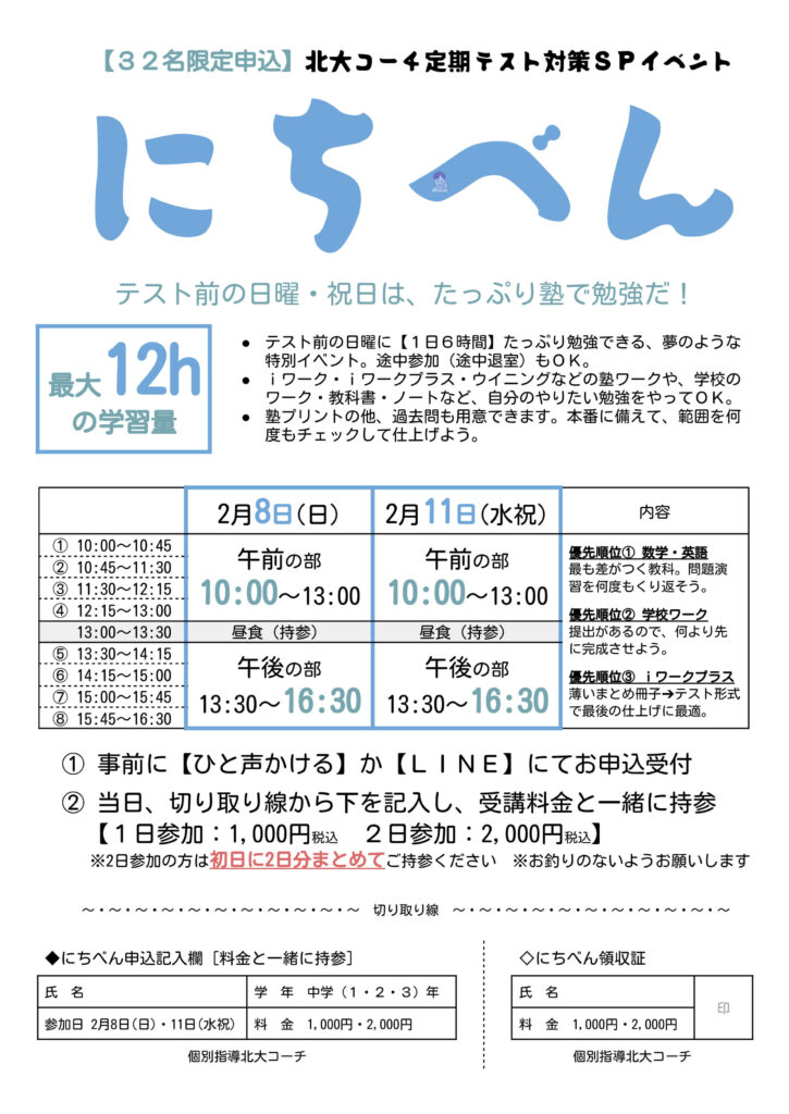 【中学生】にちべん 2/8.11 2026.01.27 26年2月8日(日)と11日(水祝)の2日間、定期テスト前の恒例行事にちべん を開催します! 塾ワーク学校ワーク定期テスト過去問 などなど。やりたいものをたっぷりやりましょう。 にちべんと言いながら水曜日もやります。