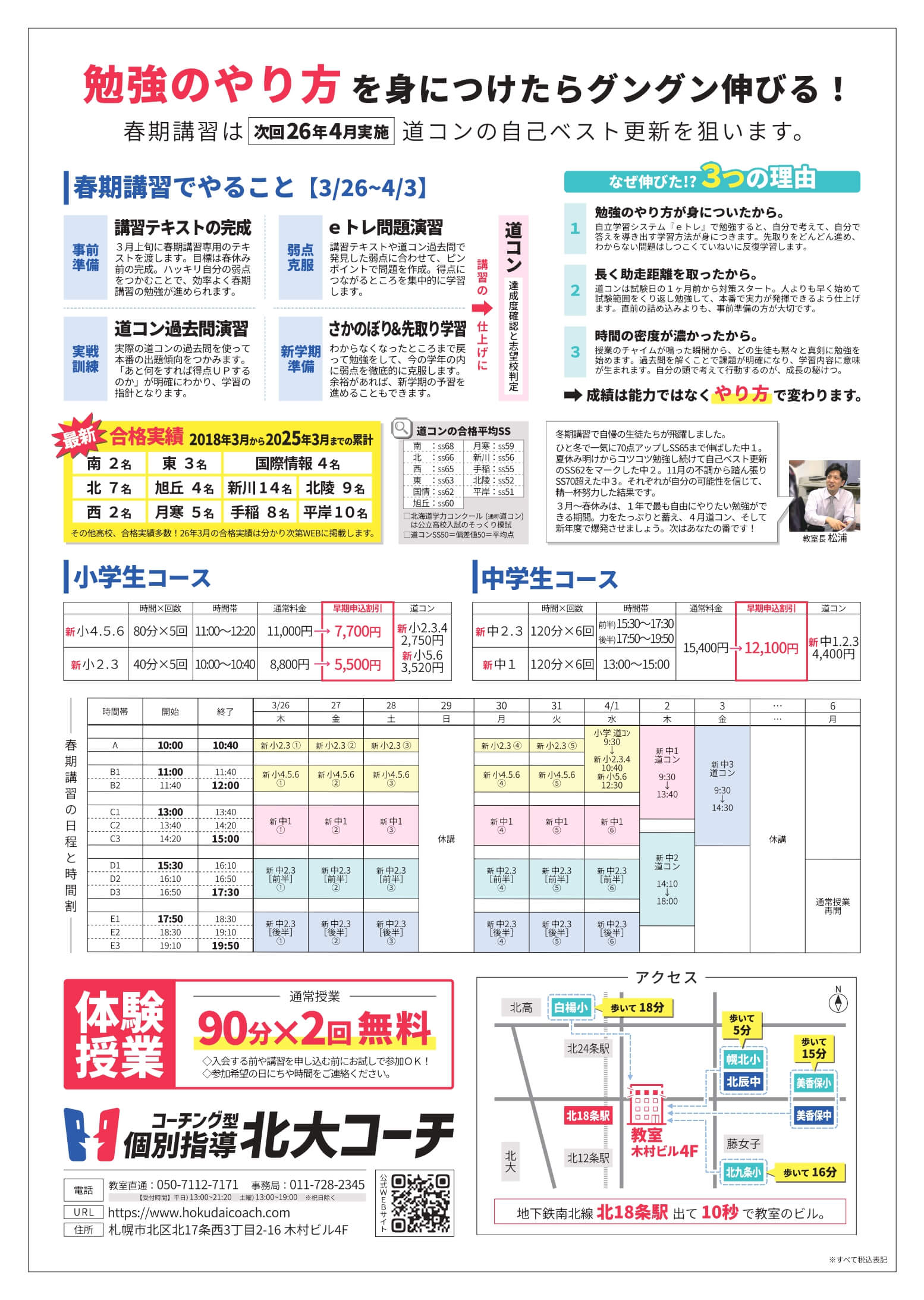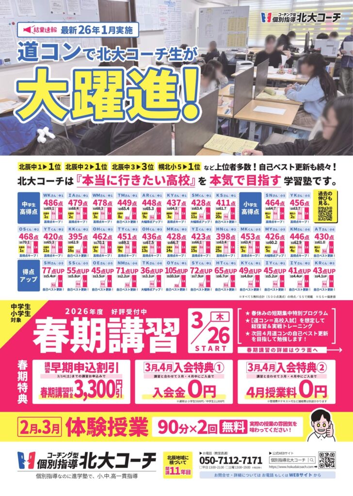 【全学年】26年3月春期講習 2026.02.06 2026年3月26日(木)から春期講習が始まります。 春期講習のご案内 お申込みはコチラ 外部生の方で参加ご希望の方は、お問合せフォームからご連絡ください。 16:00以降は授業が始まるので、LINEやメールフォームからのお問合せが確実です。 ※会員の方は自動でお申込みとなるので、別途お申込みはご不要です。 お問合せお問い合わせ お電話 LINE メールフォーム お電話 教室直通:050-7112-7171事務局: 011-728-2345事務局は13:00〜19:00までの受付となります。お電話がつながりやすいのも、この時間帯となります。16:00か...