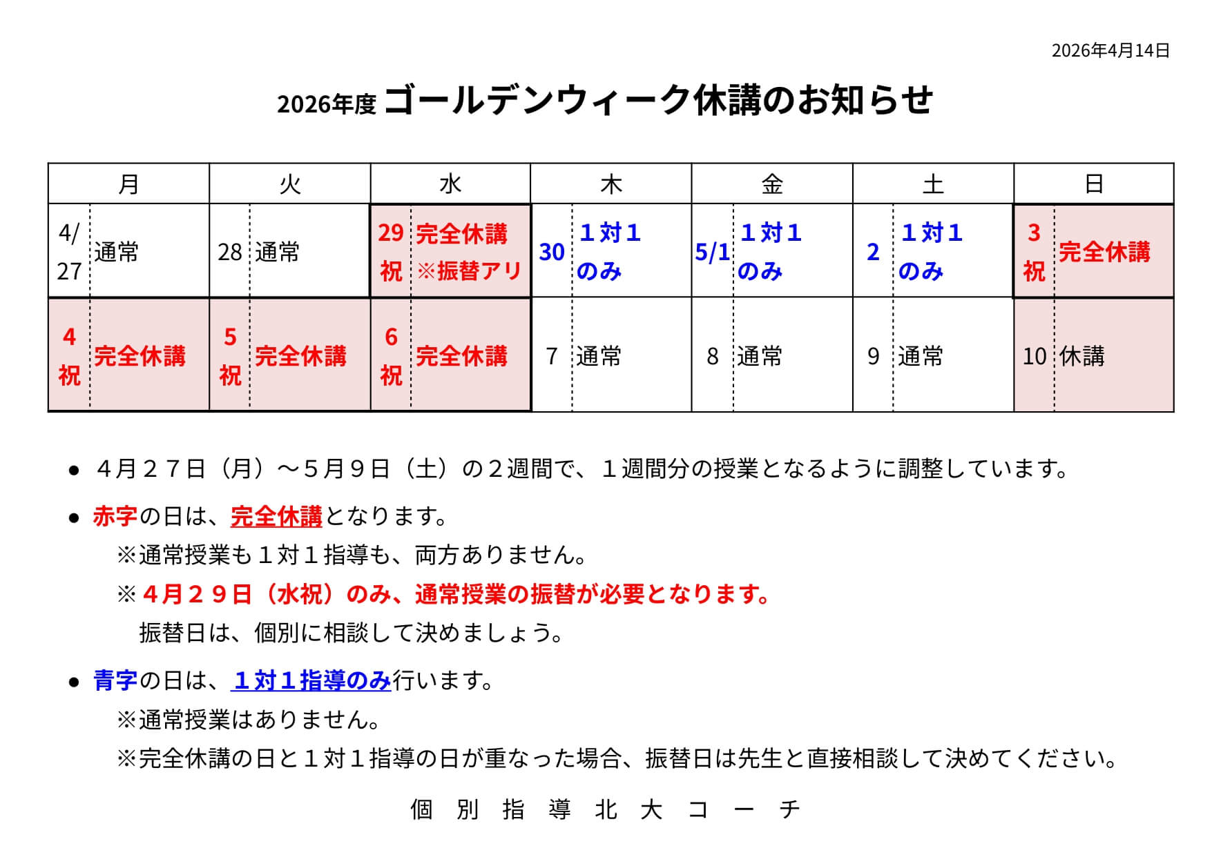 【26年4月】GW休講のお知らせ 2026.04.15 GW期間の休講予定についてお知らせいたします。4月27日~の週と、5月4日~の週を合わせて1週間とします。以下の点、ご注意ください。 <ポイント①>日曜日・祝日は休講です。 <ポイント②>4月29日(水祝)のみ、振替が必要になります。振替日程については、個別に相談に乗らせていただきます。 <ポイント②>4月30日(木)・5月1日(金)・2日(土)は1対1指導のみ実施します。通常授業はありません。 その他、不明な点がございましたらご連絡ください。よろしくお願いいたします。