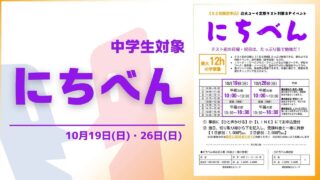 お知らせ 【中学生】にちべん 10/19.26 北辰中の定期テストが迫ってきたので、直前の2週にわたって『にちべん』を開催します! 勉強のテーマは人それぞれ。た~~~っぷり勉強しましょう。 2025.10.07 お知らせ